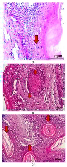 (a) Histological cross section of one of the verrucous nodulations sampled from the ventral surface of the hind flipper of a Green turtle where it shows epidermal internuclear inclusions (arrow) within epidermis manifesting ballooning degenerations (40× magnification with haematoxylin and eosin stain; scale bar = 20 µm). (b) Histological cross section of one of the verrucous nodulations sampled from a Green turtle where it shows Acanthosis and orthokeratotic hyperkeratosis with necrosis of the stratum basale (arrow) (40× magnification with haematoxylin and eosin stain; scale bar = 20 µm). (c) Histological cross section of one of the verrucous nodulations sampled from the ventral surface of the hind flipper of a Green turtle where it shows epidermal hyperplasia (arrow) (40× magnification with haematoxylin and eosin stain; scale bar = 20 µm). (d) Histological cross section of one of the verrucous nodulations sampled from the ventral surface of a Green turtle where it shows Horn Cyst (arrow) (40× magnification with haematoxylin and eosin stain; scale bar = 20 µm).