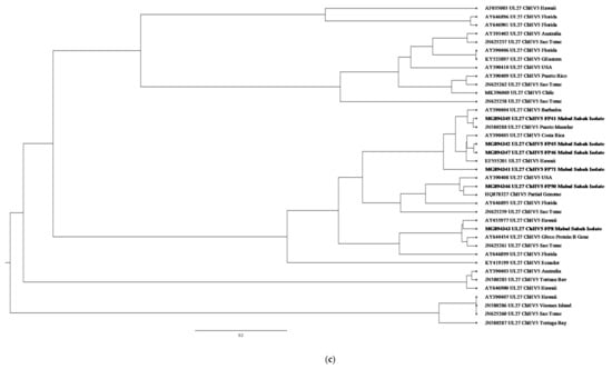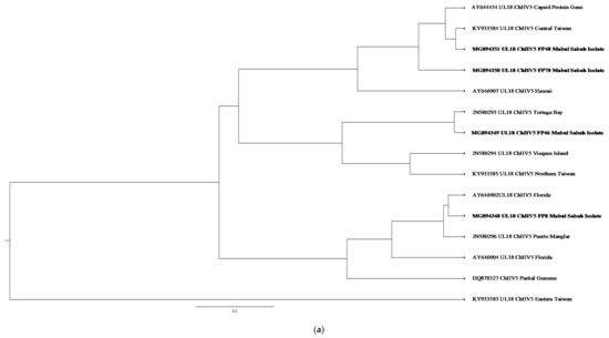 Phylogenetic analysis inferred using BEAST v2,50 and visualised using FigTree software (http://tree.bio.ed.ac.uk/software/figtree/, accessed on 19 May 2020) showed clusters and distribution of the ChHV5 strain from Mabul Island and isolates from other geographical regions. The ChHV5 Major capsid protein gene (UL18) from Mabul Island indicates that the Mabul Island strain is clustered closely to the Brazilian strain of Vieques Island, Puerto Manglar, and Tortuga Bay.