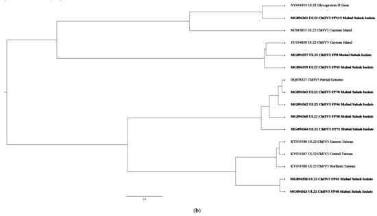 On the other hand, the ChHV5 glycoprotein H gene sequences (UL22) indicate that the Mabul Island strain is clustered together with those from Cayman Island. Four viral sequences of the ChHV5 glycoprotein H gene sequences (UL22) from Mabul Island strain were clustered into a separate branch. Some of the viral sequence of ChHV5 major capsid protein gene (UL18) and ChHV5 glycoprotein h gene (UL22) from Mabul island followed similar pattern, clustering with the viral strain from Taiwan. A recent study by Li et al. [] compared the Glycoprotein B gene from Taiwan, indicating that the Taiwanese strain was also grouped with those from Hawaii, Sao Tome, and Puerto Rico, which is similar to the Mabul strain.
