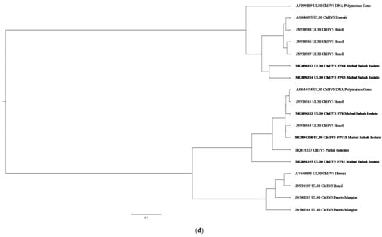 Various hypotheses have been suggested for ChHV5 to be present in both FP-exhibiting and clinically healthy turtles. At present, latent infection is the most accepted hypothesis for these conditions. Like most Herpesvirus infection characteristics, the virus is capable of causing latent infections in their host [,]. This characteristic plays a crucial role during latent infections, as the viral gene is still present but the expression is minimised. By using four genic regions for the detection of ChHV5, Alfaro-Núñez and Gilbert [] hypothesised that the detection accuracy is proportional to the viral DNA concentration and the sizes of the tumour sample. Similarly, the ability of the viral DNA to anneal to the primers during PCR plays a major factor as well. As such, it presents a challenge in detecting ChHV5 in latent infections. Hence, an absence of tumour does not necessarily indicate the absence of ChHV5 infection. This hypothesis was supported by previous research conducted by Alfaro-Nunez et al. [] and Jones et al. []. All ChHV5 positive sequences from our study have been deposited in GenBank (https://www.ncbi.nlm.nih.gov, accessed on 7 December 2020) with the accession numbers MG894341-MG894365. Phylogenetic analysis inferred using the ML method showed clusters and distribution of the ChHV5 strain from Mabul Island and isolates from other geographical regions. The phylogenetic tree was constructed from the sequences obtained from BLAST nucleotide search. The phylogenetic trees were constructed with capsid protein gene (UL18), glycoprotein H gene (UL22), glycoprotein B (UL27), and DNA polymerase gene (UL30) sequences (Figure 4a–d).