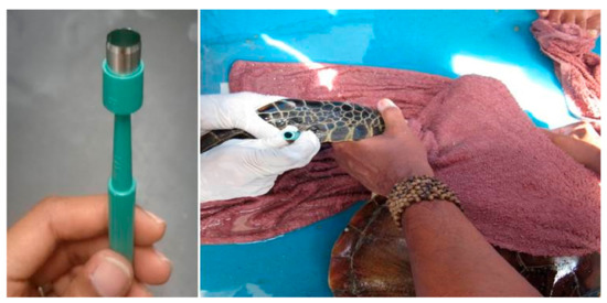 Collection of tissue samples from a juvenile Green turtle from the fore flipper using a 6mm skin biopsy punch.