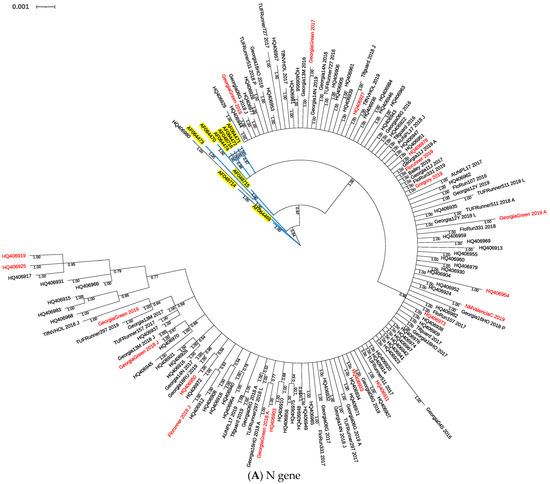 Nucleotide sequences were aligned using Clustal W with default settings in Geneious Prime®. Sequence alignments were manually corrected when necessary. For the N gene, a nucleotide alignment of 150 TSWV isolates collected in Georgia, including 59 isolates collected in this study, 82 isolates collected in 2010 (GenBank accession numbers: HQ40603-HQ406984, accessed on 05 may 2021), and nine isolates collected in 1998 (GenBank accession numbers: AF048714-AF018716 and AF064469-AF064474, accessed on 05 may 2021), were used for the analysis. The nine isolates were collected from peanut and solanaceous crops in Tift County in 1998 [46]; while the 80 isolates were collected from peanut in ten counties in Georgia, and two isolates were from solanaceous crops collected in Tift County in 2010 [40]. Sequence alignments of partial NSs and GnGc genes were obtained from 59 TSWV isolates and used for the analysis. Sequence alignments for the partial NSm gene and RdRp genes were obtained from 58 and 52 TSWV isolates, respectively.