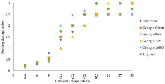 Thrips feeding injury evaluated at 3-day intervals for up to 30 days after thrips released on TSWV-susceptible and -resistant peanut cultivars. Florunner and Georgia Green are TSWV-susceptible cultivars, and Georgia-06G, Georgia-12Y, Georgia-16HO, and Tifguard are TSWV-resistant cultivars. Median feeding damage indices are presented for each evaluating day. Evaluating days denoted with “*” indicate significant cultivar effects on thrips feeding injury at p < 0.05 based on the Wilcoxon Score and Kruskal–Wallis test. Six plants of each cultivar were placed in a thrips-proof cage, and ten thrips were released at the base of each plant at the two-node stage. The experiment was conducted two times (n = 12 for each cultivar).