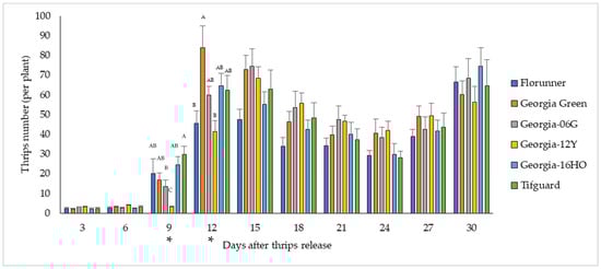 Mean number of thrips surviving on peanut plants over the course of 3–30 days after thrips released on TSWV-susceptible and -resistant cultivars. Florunner and Georgia Green are TSWV-susceptible cultivars, and Georgia-06G, Georgia-12Y, Georgia-16HO, and Tifguard are TSWV-resistant cultivars. Evaluation days denoted with “*” indicate significant cultivar effects on thrips survival, and bars labelled with the same letter were not significantly different from each other at p < 0.05. Six plants of each cultivar were placed in a thrips-proof cage, and ten thrips were released at the base of each plant at the two-node stage. The experiment was conducted two times (n = 12 for each cultivar).
