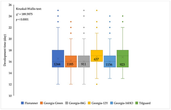 Developmental time of Frankliniella fusca to complete one generation (adult to adult) on leaflets of TSWV-susceptible and -resistant peanut cultivars. Florunner and Georgia Green are TSWV-susceptible cultivars, and Georgia-06G, Georgia-12Y, Georgia-16HO, and Tifguard are TSWV-resistant cultivars. The ‘horizontal line’ and ‘X’ in the box are median and mean developmental time, respectively. Dots are outliers based on 1.5 times of interquartile range. Sample size is labelled in the box. Ten female adult thrips were released on leaflets in each Munger cage and allowed to lay eggs for 72 h and removed; cages were monitored at 24 h intervals to record newly emerged adult thrips. Data were analyzed by Wilcoxon tests of NPAR1WAY procedure in SAS; significance of the test was determined by Kruskal–Wallis test.