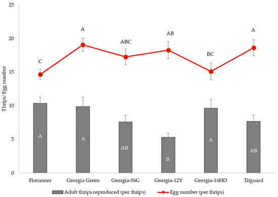 Mean and standard error of number of adult Frankliniella fusca produced and number of eggs oviposited per female released on leaflets of TSWV-susceptible and -resistant peanut cultivars. Florunner and Georgia Green are TSWV-susceptible cultivars, and Georgia-06G, Georgia-12Y, Georgia-16HO, and Tifguard are TSWV-resistant cultivars. Ten female adult thrips were released on leaflets in each Munger cage and allowed to lay eggs for 72 h and removed; cages were monitored at 24 h intervals to record newly emerged adult thrips. Mean thrips number followed by the same letter are not significantly different from each other at p < 0.05. Five female adult thrips were released on leaflets in each petri dish cage and allowed to lay eggs for 72 h and removed; eggs were stained and counted under a dissecting microscope.