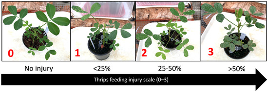 Thrips feeding injury scale of 0–3, where 0 represents no injury, and 1 to 3 represent <25%, 25–50%, and >50% leaf area of individual leaflets having feeding scars, respectively.