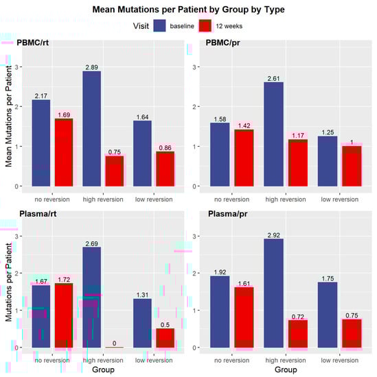The last line of Table 1 shows the count of patients classified in each reversion group, and Figure 1 shows the average number of mutations per patient for each of the groups within the four classes of blood fraction (PBMC or plasma) and region on the pol gene (reverse transcriptase or protease). The “All Resistant Subjects” column includes all three reversion groups.