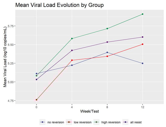Figure 2 shows the mean profile of the viral load dynamics for all of the reversion groups. The mean viral load increased during the test period for the high and low groups by more than 0.5 log10. However, the viral load of the no reversion group rose until week 8 and then declined. It only increased over the study period by 0.136 log10. Overall, the groups, including the controls, increased by an average of 0.568 log10. In addition, the high and low reversion groups’ viral load increase was statistically significant. A paired two-sample t-test of the difference between viral load in all resistant patients (groups High, Low, and No taken together) at baseline and at week 12 had a value of t = 6.2919 with 35 degrees of freedom and p < 1.0 × 10−6. The linear increase in viral load in the current cohort contrasts with the rapid rise in viral load reported in a previous study [9].