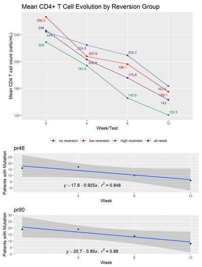 The analysis compared the viral load and CD4+ T cell count dynamics considering patients’ reversion categories. The dynamics of the protease and reverse transcriptase mutations were analyzed by linear regression and Kaplan–Meier survival analysis [57,58,59,60,61]. Given that we had only four time data points (baseline and weeks 4, 8, and 12), we were concerned that regression projections forward of the time of return to wild type would be overly aggressive. While the Kaplan–Meier survival analysis gives an alternate view of the mutations’ survival against their transformation into wild type, it is not intended for projection [62].