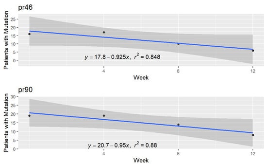 The mean number of weeks for the protease inhibitor mutations is 34.5 weeks with a standard deviation of 27.3 weeks. Figure 4 illustrates the transition to wild type virus for codons 46 and 90. These were chosen for display because they have the highest coefficients of determination (R2) among the PI mutation codons. Graphs for the other codons are found in the data repository for the study (https://github.com/jameshunterbr/ATI, accessed on 5 October 2021).