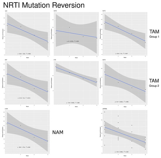 Both TAM groups have mean values very close to each other. According to a sample of 3 per group, there is no difference between the two TAM types with a Wilcoxon Rank Sum test (p = 1.0). However, the TAMs considered together take a significantly longer time to revert to wild type than codon 184 according to a one-sided Wilcoxon Signed Rank test (p = 0.016). This started with 28 patients exhibiting the Valine mutation, the loss of one carbon atom that distinguishes it from the Isoleucine wild type. By the end of the 12 weeks, the number showing this mutation had dropped to 8, and our linear regression model for this codon projected it would be eliminated by week 16. The TAM groups showed fewer patients with the mutations at the start of the interruption (20.7 for TAM 1 and 17.7 for TAM 2), declining to 8.3 and 7.7, respectively, at the end of the study. The higher rate of reversion for I184V than the TAMS can be seen in greater detail in the panels of Figure 5, which show all of the NRTI codons.