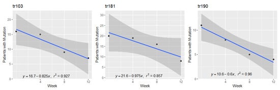 This figure shows the number of patients with a mutation at each test and a regression of these points. The regression equation shows the parameters determining the line, and the R2 indicates the degree to which the line explains the points.
