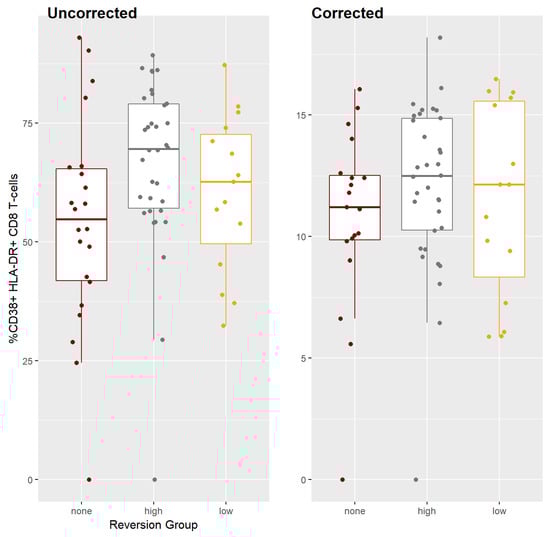 The study sample showed a greater presence of CD38+ and HLA-DR+ proteins on CD8+ T cells in patients who returned to wild type. The no reversion group, whose mutations remained constant despite the treatment interruption, expressed a significantly lower level of these cell activation biomarkers (measured by the percentage of CD8+ T-cells with both CD38 and HLA-DR present) than did the high reversion group. Table 5 and Figure 7 show these summary measures.