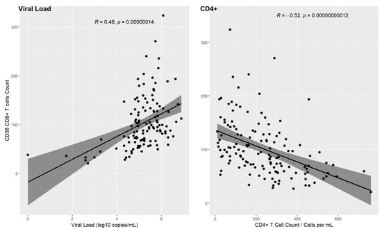 Previous research has found a positive association between viral load and CD38+ CD8+ T cells [31]. Our correlation results do not show the same level of significance in such an association.