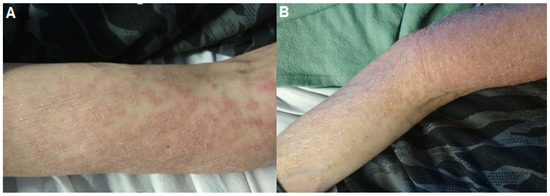 The lesions developed as erythematous scaly follicular papules (A) and plaques over both forearms (B).