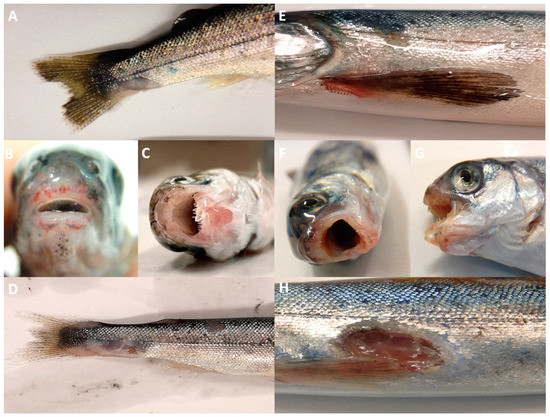 - Avendaño-Herrera, R.; Collarte, C.; Saldarriaga-Córdoba, M.; Irgang, R. New salmonid hosts for Tenacibaculum species: Expansion of tenacibaculosis in Chilean aquaculture. J. Fish Dis. 2020, 43, 1077–1108. [Google Scholar] [CrossRef]