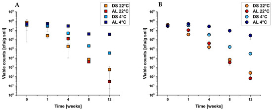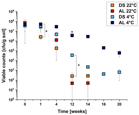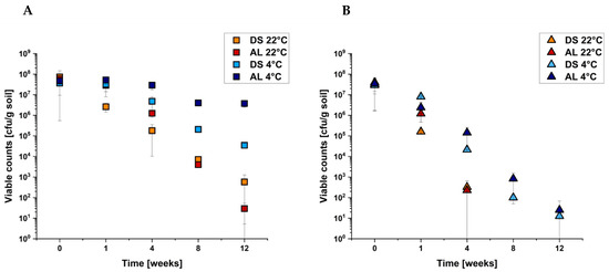 Summarizing the results, it was clearly shown that under all conditions applied, strain C227/11Φcu could survive for at least 12 weeks in soil microenvironments with a maximum decrease of 106 cfu/g at 22 °C in AL and a minimum decrease of 101 cfu/g in AL at 4 °C. Survival up to 20 weeks occurred in DS and AL at 4 °C, with a decrease in cfu/g of 105 and 103, respectively.