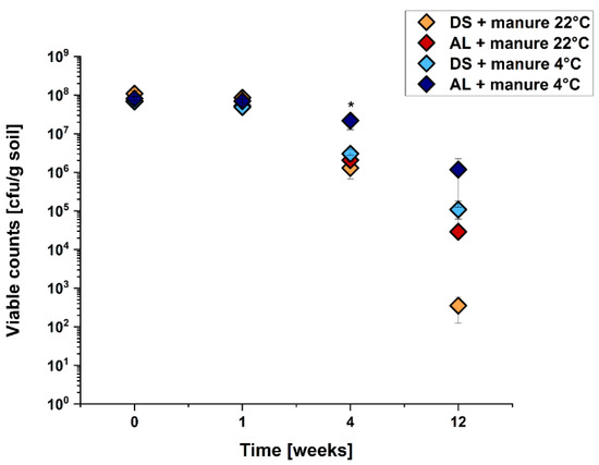 They show that the application of cattle manure increased the survival of E. coli O104:H4 strain C227/11Φcu when the samples were stored at 22 °C. In contrast to the prior experiments shown in Figure 1, no decrease in viable counts of the 22 °C samples was detected within the first week of incubation. During the further incubation period, the viable counts decreased. However, the rate of decrease was lower compared to those depicted in Figure 1, indicating a positive effect of manure on the survival of C227/11Φcu. The incubation in AL at 22 °C without cattle manure resulted in a decrease of 5 log units within 12 weeks (Figure 1), which was only 3 log units when cattle manure was added (Figure 2).