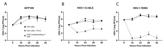 Vero cells were obtained from the American Type Culture Collection (Manassas, VA) and used to grow HSV-1 McKrae strain at a stock titer > 1 × 108 PFU/mL. The ICP0-complementing L7 cell line was originally obtained from Neal Deluca (University of Pittsburgh) [57]. Vero cells were propagated in Roswell Park Memorial Institute (RPMI) 1640 medium supplemented with L-glutamine, 10% fetal bovine serum (FBS) and antibiotics (complete media) (ThermoFisher/Life Technologies Ltd., Paisley, United Kingdom) whereas L7 cells were propagated in Dulbecco’s Modified Eagle’s medium (DMEM) supplemented with 10% FBS and antibiotics (DMEM complete media) (ThermoFisher). For growth curve analysis, L7 and Vero cell monolayers were established in 24-well plates at a density of 1.3 × 105 cells/well in 1.0 mL of DMEM or RPMI complete media respectively. One-half of the Vero cell cultures were treated overnight by the addition of 200 units of recombinant IFN-β (RnD Systems, Minneapolis, MN). Sixteen hours later, the cells were infected with 25,000 PFU HSV-1 GFP105, 0∆RING, or 0∆NLS/mL inoculum of each virus [50] to achieve a multiplicity of infection (MOI) of 0.1. Following a 60 min incubation at 37 °C in a 5% CO2, 95% air atmosphere to allow for absorption, cell monolayers were rinsed with 1.0 mL DMEM or RPMI complete media and 1.0 mL DMEM or RPMI complete media was added. Cultures were incubated at 37 °C in a 5% CO2 95% air atmosphere. At 18, 24, 36, or 48 hr pi, designated cultures including cells were collected and stored at –80 °C. Thawed samples were subsequently assessed for viral titers by plaque assay using L7 cell monolayers in a standard plaque assay [26].