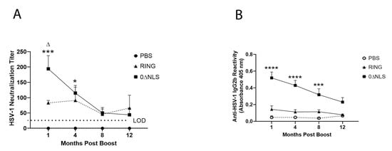2.4. Anti-HSV-1 Antibody Titers Are Lost over Time following Vaccination with 0∆NLS or 0∆RING
