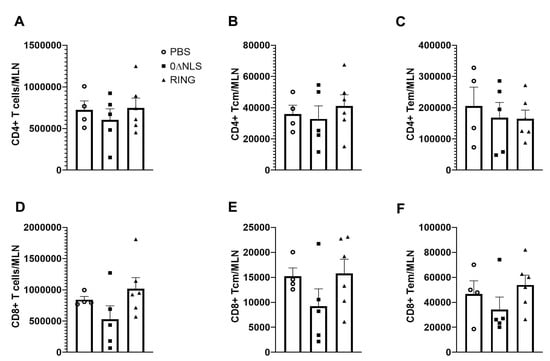 Previously, we have found a reduction in the infiltration of leukocytes into infected tissue or undergoing clonal expansion in the draining lymph nodes of 0∆NLS vaccinated mice challenged with HSV-1 [26,28,37]. Since there was some degree of protection most pronounced in the 0∆NLS vaccinated group challenged with HSV-1 in the long-term study, we next investigated clonal expansion of lymphocyte populations in vaccinated mice following virus challenge. Analysis of the CD4+ T cell populations found vaccinated mice had similar levels of total CD4+ (Figure 6A), CD4+ central memory (Figure 6B), CD4+ effector memory (Figure 6C), total CD8+ (Figure 6D), CD8+ central memory (Figure 6E) and CD8+ effector memory (Figure 6F) T cells in the MLN 7 days pi. In a similar fashion, HSV-1-specific CD8+ T cells were also found to be similar in frequency and number amongst the vaccinated group of mice indicating no loss in clonal expansion regardless of the vaccine given (data not shown).