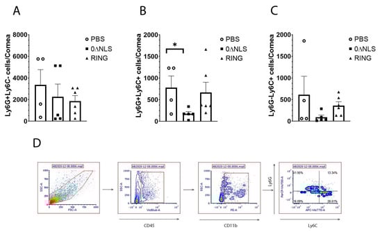 Next, we investigated the infiltration of myeloid cell populations including neutrophils (CD45+CD11b+Ly6G+Ly6C-), inflammatory monocytes (CD45+CD11b+Ly6G+Ly6C+) and macrophages (CD45+CD11b+Ly6G-Ly6C+) into the cornea of vaccinated mice (Figure 7A–D). Whereas neutrophil and macrophage influx into the infected cornea of mice was not altered between vaccinated groups, the number of inflammatory monocytes residing in the infected cornea of 0∆NLS-vaccinated mice was lower than that found in 0∆RING-vaccinated mice and significantly lower compared to PBS-vaccinated animals (Figure 7A–C). CD4+ and CD8+ T cell populations did not average above 100 cells/cornea and were not found to be different between groups of vaccinated mice (data not shown).