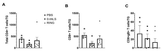 Since there was a significant drop in infectious virus recovered from the TG of 0∆NLS- compared to PBS-vaccinated mice (Figure 4E) and CD8+ T cells are instrumental in controlling local infection in the TG [38,39], we next investigated T cell infiltration in the TG post HSV-1 infection in vaccinated mice. The results show no significant differences in the total number of CD4+ (Figure 8A) or CD8+ (Figure 8B) T cells residing in the TG of vaccinated mice following infection. Furthermore, there was no difference in the number of HSV-1 glycoprotein B-specific CD8+ T cells in the TG of vaccinated mice post HSV-1 infection (Figure 8C). Taken together, the drop in HSV-1 titer in the TG of 0∆NLS-vaccinated mice compared to PBS- or 0∆RING-vaccinated animals does not correlate with the number of T cells recruited to the TG during acute infection.