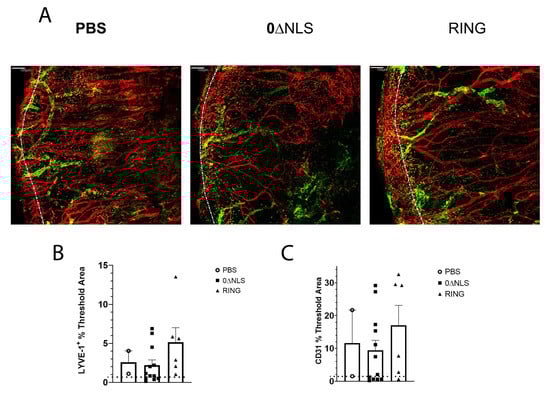 Tissue pathology in the form of blood and lymphatic vessel genesis is observed following acute HSV-1 infection in naive mice [40,41,42,43]. As a means to further compare/contrast long-term vaccine efficacy against acute challenge with ocular HSV-1 infection, assessment of neovascularization (blood and lymphatic vessel genesis) in the cornea was conducted comparing PBS-, 0∆RING- and 0∆NLS-vaccinated mice 30 days pi following infection 365 days post vaccine boost. The results show no differences in the level of new vessel growth comparing the control (PBS)-vaccinated group to either the RING- or 0∆NLS-vaccinated mice 30 days pi (Figure 9A–C). These results are consistent with the results showing similar levels of infectious virus recovered in the cornea of vaccinated mice during acute infection. Thus, unlike what is observed in 0∆NLS-vaccinated animals challenged with HSV-1 30 days post-boost, the efficacy of the 0∆NLS vaccine is lost in terms of preventing corneal neovascularization one-year post-vaccine boost.