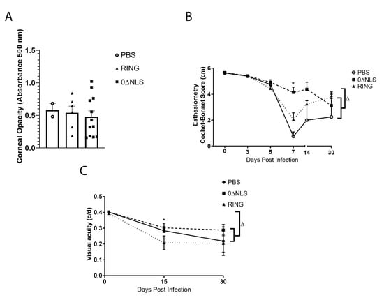 HSV-1 infection of the cornea generates a robust inflammatory response that leads to a loss in corneal innervation [44,45] and typically results in tissue pathology including opacity [46]. Therefore, mechanosensory function that aligns with innervation [47] was evaluated along with cornea opacity in vaccinated mice following ocular HSV-1 infection. In comparison to the control (PBS)-vaccinated animals, 0∆RING- and 0∆NLS-vaccinated mice displayed similar levels of corneal opacity 7 days pi (Figure 10A). However, there were modest differences in mechanosensory function comparing the vaccinated mice temporally following infection. Specifically, there was a pronounced difference between 0∆NLS-vaccinated mice compared to the 0∆RING- or PBS-vaccinated groups at day 7 pi with very little loss in the blink reflex of the 0∆NLS-vaccinated mice compared to the other vaccinated groups that lost between 60–80% of their response (Figure 10B). However, by day 30 pi the blink reflex of the 0∆NLS vaccinated mice had modestly dropped whereas the 0∆RING- and PBS-vaccinated animals blink reflex had partially recovered. Consequently, by day 30 pi there was an overall loss in mechanosensory function that ranged from 30–40% in the 0∆RING- and 0∆NLS-vaccinated mice up to a 63% loss in the control (PBS)-vaccinated group all of which was significant compared to the mechanosensory function of the eye in uninfected, vaccinated mice (Figure 10B).