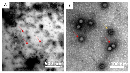 Transmission electron microscopy of the virus-like particles (VLPs) used in the experiments. Magnification: (A) 14,000×; (B) 110,000×. Some VLPs appeared to be packed, presumably with cytoplasmic material from the Pichia host cells (red arrows), while others were empty (yellow arrow). Photo credit: Istituto Zooprofilattico Sperimentale Venezie (IZSVe, Padua, Italy).