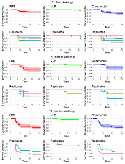 Survival curves of the pooled data for each treatment and for the replicate tanks at each challenge timepoint/route: T1 bath and T1 injection 93 days (~3 months/1800 dd) after vaccination and T2 injection 240 days (~7.5 months/4500 dd) after vaccination. Temperature data from each challenge is available in Figures S2–S5. PBS = mock vaccination with phosphate-buffered saline, VLP = vaccination with RGNNV virus-like particles, Commercial = vaccination with a commercial vaccine.
