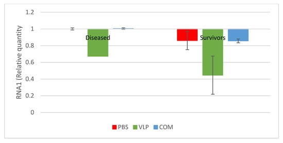 Relative amounts of viral RNA in brains of diseased and survivors in T1 bath challenge (3 months post-vaccination). Only positive samples included. Scaled to the mean of the PBS-diseased group (Amount of virus in PBS-group = 1). Error bars indicate the standard error of the mean (SEM) (n = 6, 1, 9, 8, 3, 6 (order as in figure)).