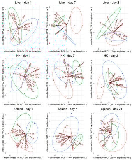 Principal component analysis of gene expression in different tissues (liver, head kidney (HK), and spleen) on days 1, 7, and 21 pv from fish vaccinated with either VLP-based vaccine (green), commercial vaccine (blue), or mock vaccinated with PBS (red). The vectors represent the influence of each gene.