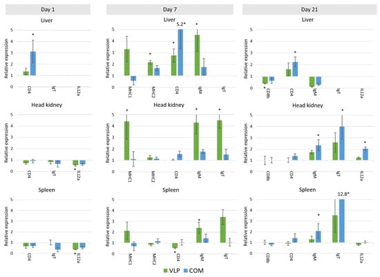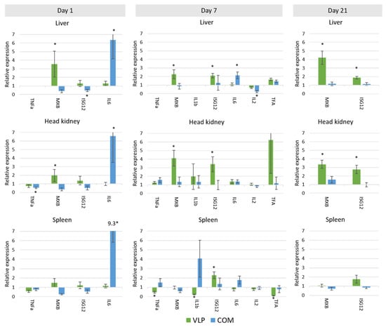 Expression of mRNA of immune genes involved in innate immunity in European sea bass vaccinated with either VLP vaccine (VLP) or commercial vaccine (COM). The expression is plotted as a relative expression to the mRNA level in mock-vaccinated fish sampled on the same timepoint. Missing bars mean that mRNA was not expressed in the given tissue. * = biologically relevant (significantly different from mock-vaccinated fish (p < 0.05, t-test) and more than double up- or downregulated compared to the mock-vaccinated fish). Data for all genes are available in Supplementary Table S3.
