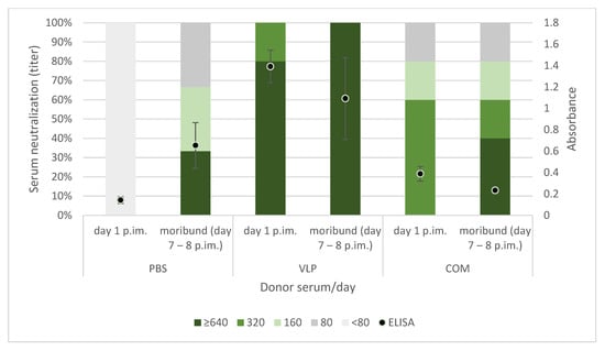 The recipient sea bass were successfully passively immunized with serum from the larger sea bass hyperimmunized with either VLP-based vaccine, commercial vaccine, or PBS (VLP-, COM- or PBS-donor serum). RGNNV-specific antibodies were detected in the recipients on day 1 (day of challenge) and in infected moribund recipient fish on day 7 or 8 postimmunization, sampled before termination (Figure 10). Interestingly, in recipient moribund fish, significant increases in specific antibodies were seen only in the fish that had received PBS-donor serum (p < 0.01, t-test).