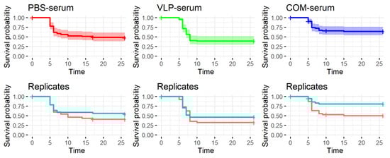 Survival after experimental challenge of sea bass passively immunized with serum from donor fish hyperimmunized with either phosphate-buffered saline (PBS-serum), virus-like particle vaccine (VLP-serum), or commercial vaccine (COM-serum). The curves in the first row represent the pooled data from both tanks. The shaded areas indicate the 95% confidence intervals of the survival probabilities. In the second row, the survival in the two replicate tanks are visualized. Time = days post-challenge.