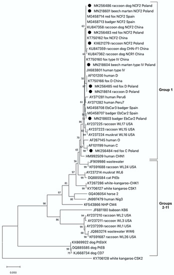 The fecal samples obtained from examined mesoranivores were analysed for the presence of E. bieneusi using the nested PCR method (Table 1). Overall prevalence of the pathogen was estimated as high as 27.3%. The infection rates for E. bieneusi varied between the carnivore species, from 13.7% in beech martens, 16.7% in pine martens, 23.0% in raccoons and 30% in red foxes to 40.4% in raccoon dogs. Based on sequence analysis of the ITS region of the rRNA gene, we detected five known genotypes of E. bieneusi. Sequence analyses revealed that the majority of E. bieneusi positive isolates were of the NCF2 genotype, identified in all examined species, with the exception of a European badger. Phylogenetic analysis showed that the identified NCF2 genotype was identical to those previously reported in the red fox (Acc. No. MG458714) and the European badger (Acc. No. MG458713), in Spain, as well as in the fox, (Acc. No. KT750162) and raccoon dog (Acc. No. KU847358), in China. Zoonotic E. bieneusi genotype D was identified in the samples obtained from the raccoon and red fox, whereas E. bieneusi genotype C was identified only in one sample derived from the red fox. These isolates were identical to those previously identified in humans (Acc. No. AF101200 and Acc. No. AF10199, respectively). The nucleotide sequences obtained from the European badger showed 100% homology with E. bieneusi genotype EbCar2 (Acc. No. MG458707), and 99.7% with genotype EbCar3, (Acc. No. MG458710) which were obtained from the European badgers from Spain. In martens, E. bieneusi NCF2 and type IV genotypes were identified. The sequence of the E. bieneusi type IV genotype was identical to the one previously published in the GenBank database, identified, e.g., in a human from Nigeria (Acc. No. JX683801), and in a fox from China (Acc. No. KT750160). All E. bieneusi genotypes recorded in this survey were clustered in Group 1 showing their zoonotic potential (Figure 1).