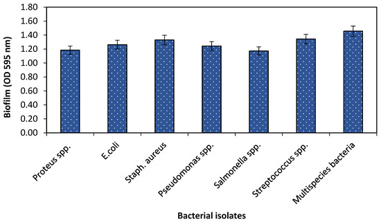 To evaluate the biofilm formation potential of single and multispecies bacteria, bacteria were grown in 24-well flat bottom polystyrene plates with optical density (OD600 0.001) in nutrient media for 24 h at 37 °C, 120 rpm in a shaker incubator. The plates were then subjected to crystal violet assay after incubation. The biofilm forming ability of single and multispecies bacteria was analyzed by measuring OD at 595 nm in spectrophotometry. The results showed that all bacteria tested have the potential to develop a biofilm. The current study revealed that all bacterial species either single or multispecies, had the ability to form a biofilm. However, multispecies had the most prominent potential of biofilm production as shown in Figure 1.