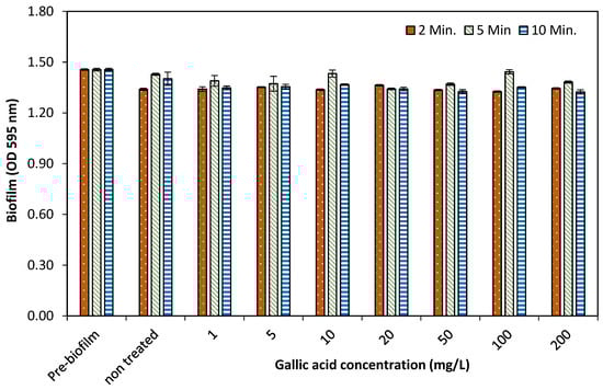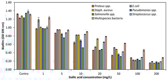 Different concentrations (1–200 mg/L) of GA were tested for their potential effects on biofilm formation against single and multispecies bacteria with OD 0.001 in 24-well polystyrene microtiter plates. Biofilm OD was measured at 595 nm of single and multispecies bacteria. Control (without GA) of all species was also measured. The study indicated that at 1–50 mg/L of GA, up to 66.3% biofilm production against single and multispecies bacteria, and at high concentrations (100–200 mg/L), biofilm formation was significantly reduced up to 85.5%, as shown in Figure 3. The current experimental study showed that GA at lower concentrations (1–50 mg/L) had no notable effects on growth and biofilm formation of single and multispecies. Although, higher concentrations (100–200 mg/L) of GA had prominent inhibitory effects on growth as well as biofilm formation.