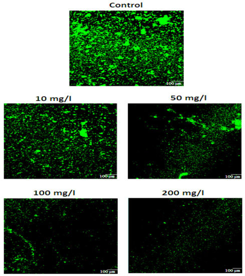 All the tested bacteria showed the biomass production in the form of biofilm development on glass surfaces. The production of biomass was potentially reduced by applying different concentrations of GA. Although lower concentrations of GA (1, 5 and 10 mg/L) showed slight biomass reduction (58.19%), while extensive biomass reduction at higher (20 mg/L and above) GA concentrations as compared to the control (without GA). The current study revealed the potential effects of GA on biomass reduction at higher concentrations as shown in Figure 5. Furthermore, the florescence microscopic images showed the biofilm development on treated and control (untreated) glass surfaces, as clearly shown in Figure 6. Images were also processed through BioImageL software for calculation of percent surface coverage and biomass. The surface coverage calculated for control was 30.2%, while it was 12% at 5 mg/L of gallic acid. Furthermore, it was observed that with increasing concentration of gallic acid, biomass surface coverage was reduced to only 2% at 200 mg/L of gallic acid. Moreover, it was observed that 13,612 (µm2) biomass was present for the control, while with increasing concentrations of gallic acid, biomass was reduced to 894 (µm2) at 200 mg/L of gallic acid Table 1.