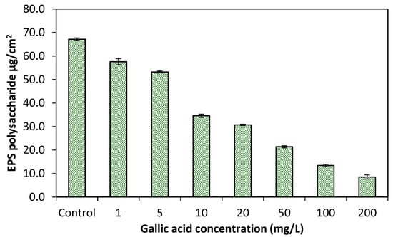 For the characterization of biofilm production different concentrations of GA were analyzed to check the effects on extra polymeric substance (EPS). OD was measured at 492 nm and quantified as µg/cm2 after the EPS extraction from glass slides. The considerable amount of EPS reduction was observed by applying different concentrations of GA as compared to the untreated sample (control), Figure 7. However, the EPS production was intensively reduced up to 88.6% at higher 20 mg/L and above concentrations of GA than the lower concentrations (1–10 mg/L) < 50%, respectively.