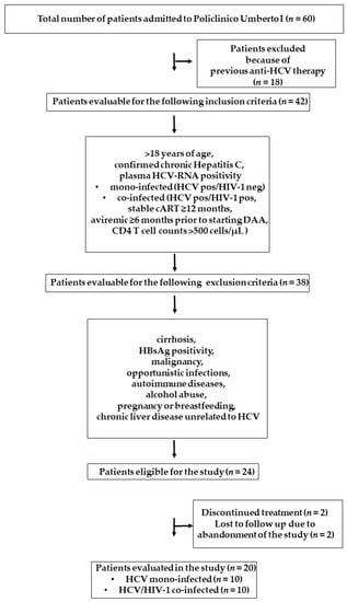 This prospective study was carried out at the Policlinico Umberto I, University of Rome “Sapienza”. Patients were distributed in two groups: HCV mono-infected (10) and HCV/HIV co-infected (10).