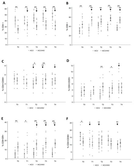 At the baseline, higher levels of CD4+CD38+ cells in HCV mono- as compared to HCV/HIV co-infected were observed, that significantly decreased over the course of treatment from 15.59% (95% CI: 13.00; 18.18) at T0 to 10.27% (95% CI: 7.73; 12.80) at T4 (Figure 2F), whereas HCV/HIV co-infected showed higher values of both CD4+CD38+ and CD8+CD38+ during the study (Figure 2F).