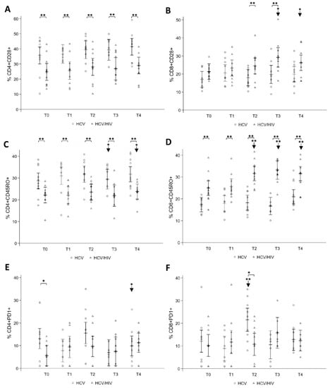 Longitudinal analysis of CD4+/CD8+ T-cell subsets before and after DAA therapy. Whole blood T-cell subsets of HCV mono-infected and HCV/HIV co-infected were compared from T0 up to T4. Levels of expression of CD28 (A,B), CD45RO (C,D), and exhaustion PD-1 (E,F) markers are shown. Statistically significant differences over time are marked by an arrow and asterisk, and differences between the two groups of patients by an asterisk. One asterisk corresponds to p < 0.05, two asterisks to p < 0.001. Data are shown as hollow circles (HCV) and triangles (HCV/HIV). Multilevel linear regressions predicted estimates are reported as mean and 95% CI.