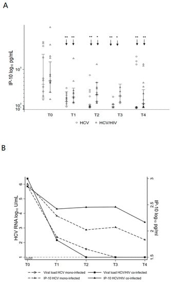 Serum IP-10 levels normalize with DAA treatment and correlate with viral kinetic decline. (A) Serum IP-10 protein levels upon treatment. Statistical analysis showed a significant change over time regardless of treatment outcome that differed between HCV mono-infected and HCV/HIV co-infected. This difference disappeared at the end of follow-up. (B) Serum IP-10 levels at baseline and during treatment mirrored changes in viral load. LLOD, lower limit of detection for viral load. (A,B) Stepwise linear structural equation model predicted estimates are shown for the HCV mono-infected and the HCV/HIV co-infected. Statistically significant differences over time are marked by an arrow and asterisk. One asterisk corresponds to p < 0.05, two asterisks p < 0.001.