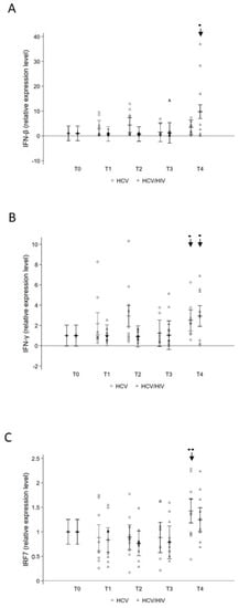 Over the course of treatment, both IFN-β and IFN-γ gene expression significantly increased at T4 in HCV/HIV co-infected and IFN-γ in HCV mono-infected (Figure 5A,B). Conversely, IRF7 gene expression showed a significant increase at T4 only in HCV mono-infected patients (Figure 5C). No statistical significance variations were observed in MX1 gene expression levels.