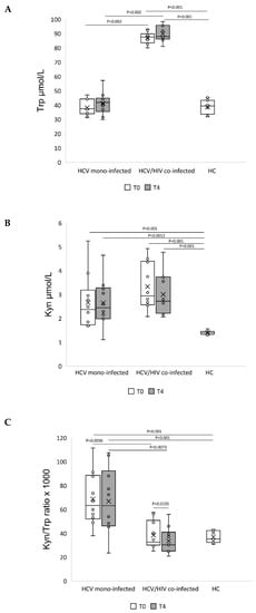 Different tryptophan catabolism outcome in DAA-treated HCV mono-infected and HCV/HIV co-infected. Plasma levels of (A) Kyn (µmol/L), (B) Trp (µmol/L), and (C) IDO enzyme activity defined as the Kyn/Trp ratio in HCV mono-infected, HCV/HIV co-infected, and healthy control (HC). Data are presented using a box plot. Comparison between groups was performed using the Wilcoxon–Mann–Whitney test, comparison among groups was performed using the Kruskal–Wallis test while change at T4 from T0 in each group was analyzed using the Wilcoxon signed rank-sum test.