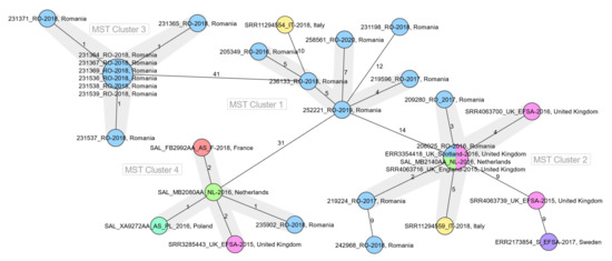 Genomic comparison revealed that four of the Romanian strains that shared the MLVA genotype G6 (206025_RO_2016, 209280_RO_2017, 219224_RO_2017, and 235902_RO_2018) were closely related with strains isolated in other European countries (between 0 to 5 differing alleles) although they were previously considered as sporadic cases. On the MST constructed with Romanian and other European sequence data, these strains were distributed in two of the four clusters delineated (Cluster 2 and Cluster 4), being grouped with strains from Italy, France, the Netherlands, Poland, and the United Kingdom, collected in 2015, 2016, and 2018 and all linked to a multi-country outbreak (Figure 3) [5].