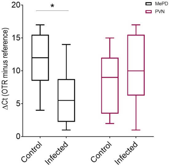 Toxoplasma gondii infection increased mRNA abundance of oxytocin (OT) in the posterodorsal medial amygdala (MePD) and the paraventricular nucleus of the hypothalamus (PVN). mRNA isolated from the PVN of infected animals showed a significant increase (decreased ΔCt values) in OT transcription compared with mRNA from the PVN of control animals (* p < 0.05). There was no difference in OT levels in the MePD of control and infected animals.